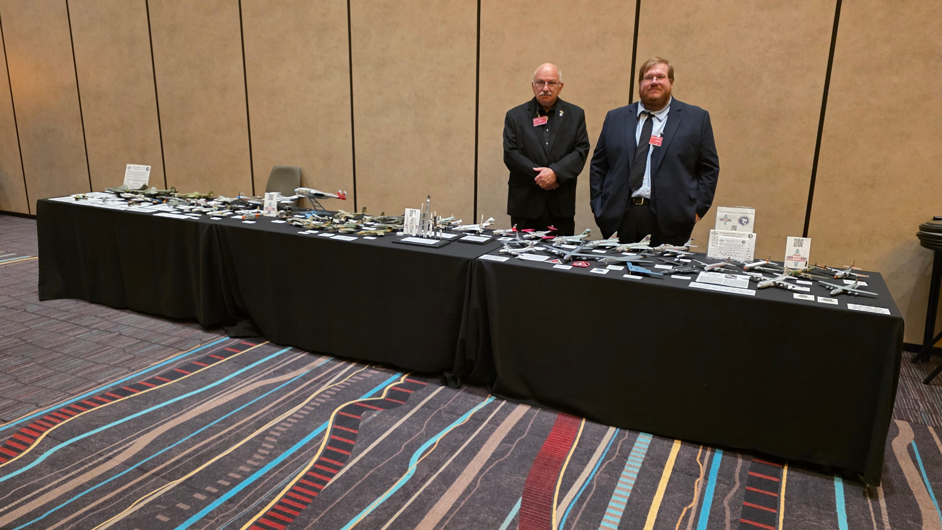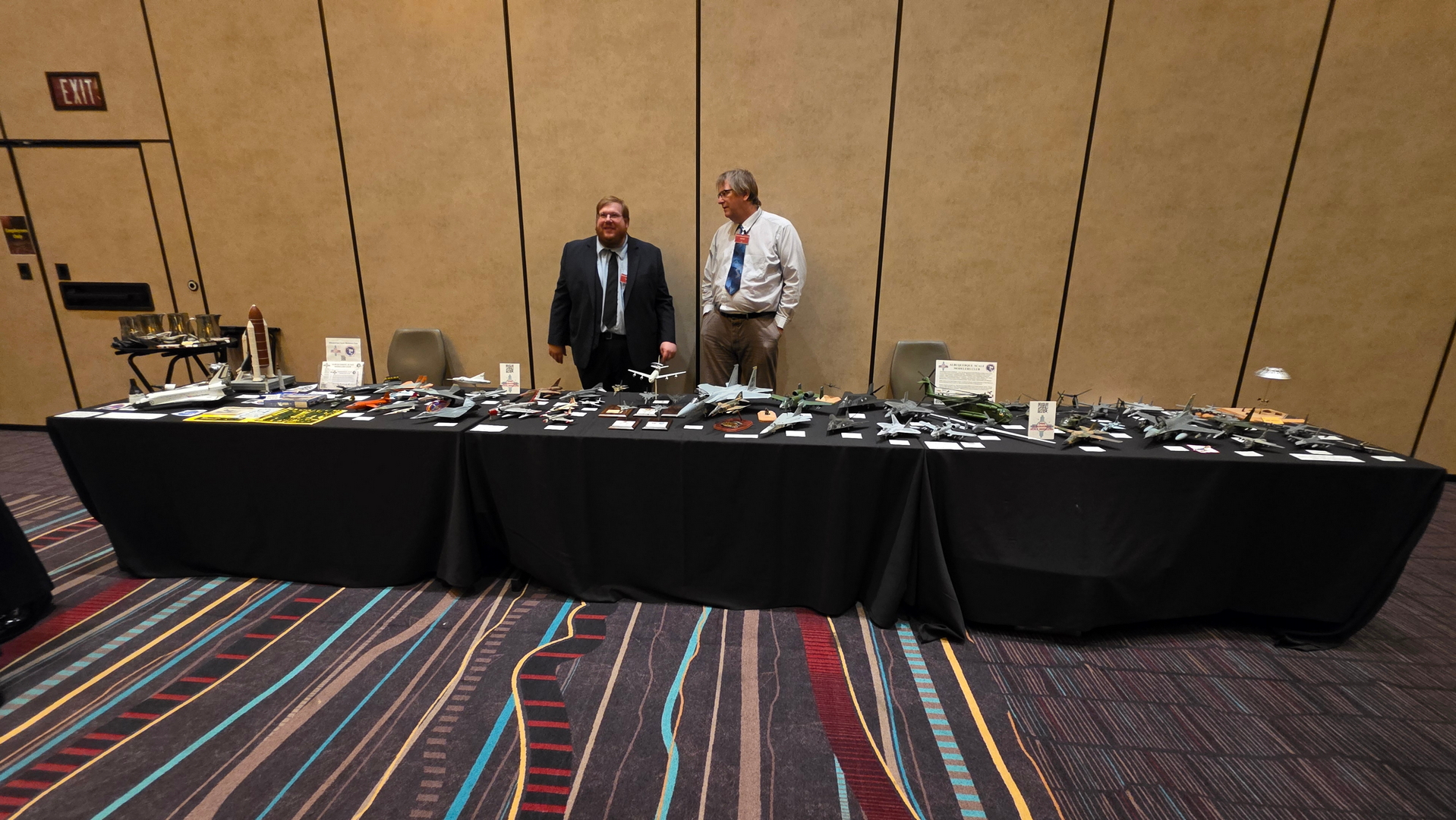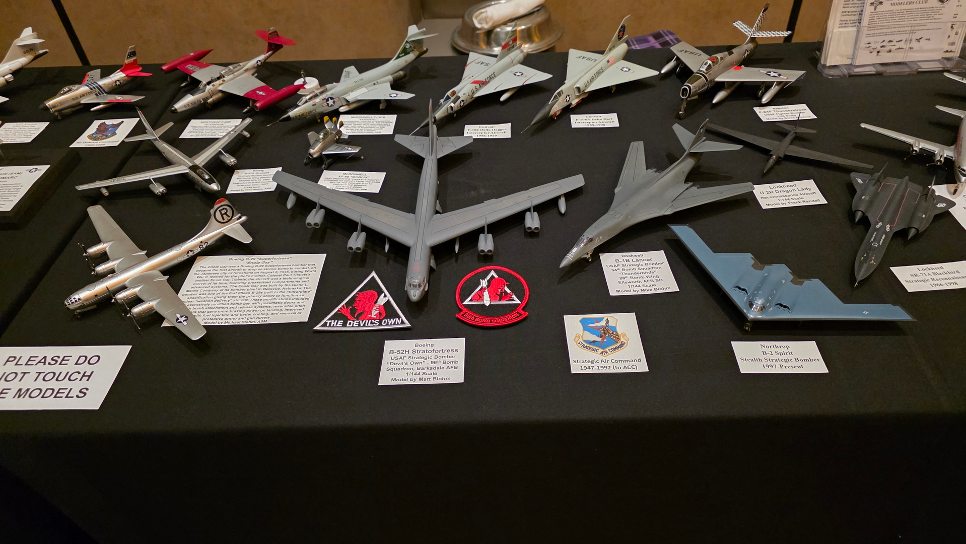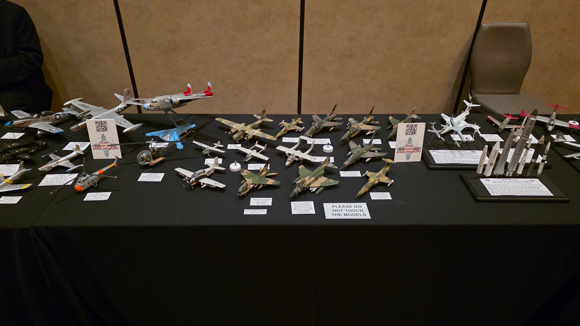 The display was set-up and manned by Brian Peck, Peter Reckhemmer, and Matt and Mike Blohm. As usual the display took about one and a half hours to set up–putting models into the correct grouping and lots of info tags to put out–and about one hour to take down. We did get a full dinner this year thanks to Peter. Models were provided by Frank Randall, Don Gatewood, Victor Maestas, Brian Peck, Len Faulconer, Bob Henderson, Steve Brodeur, David Epstein, and Matt and Mike Blohm. Thanks to all who participated and loaned models. Thanks to Hobby Proz for letting us stage the model tubs at the shop. Please contact me if you are interested in building models to fill out the aircraft types that we still need for the display, including the 1920-30’s period. My own priorities for the 2026 displays will be finishing my 1/144 scale B-36, MC-130J Commando II, and C-133 with a Thor IRBM.
