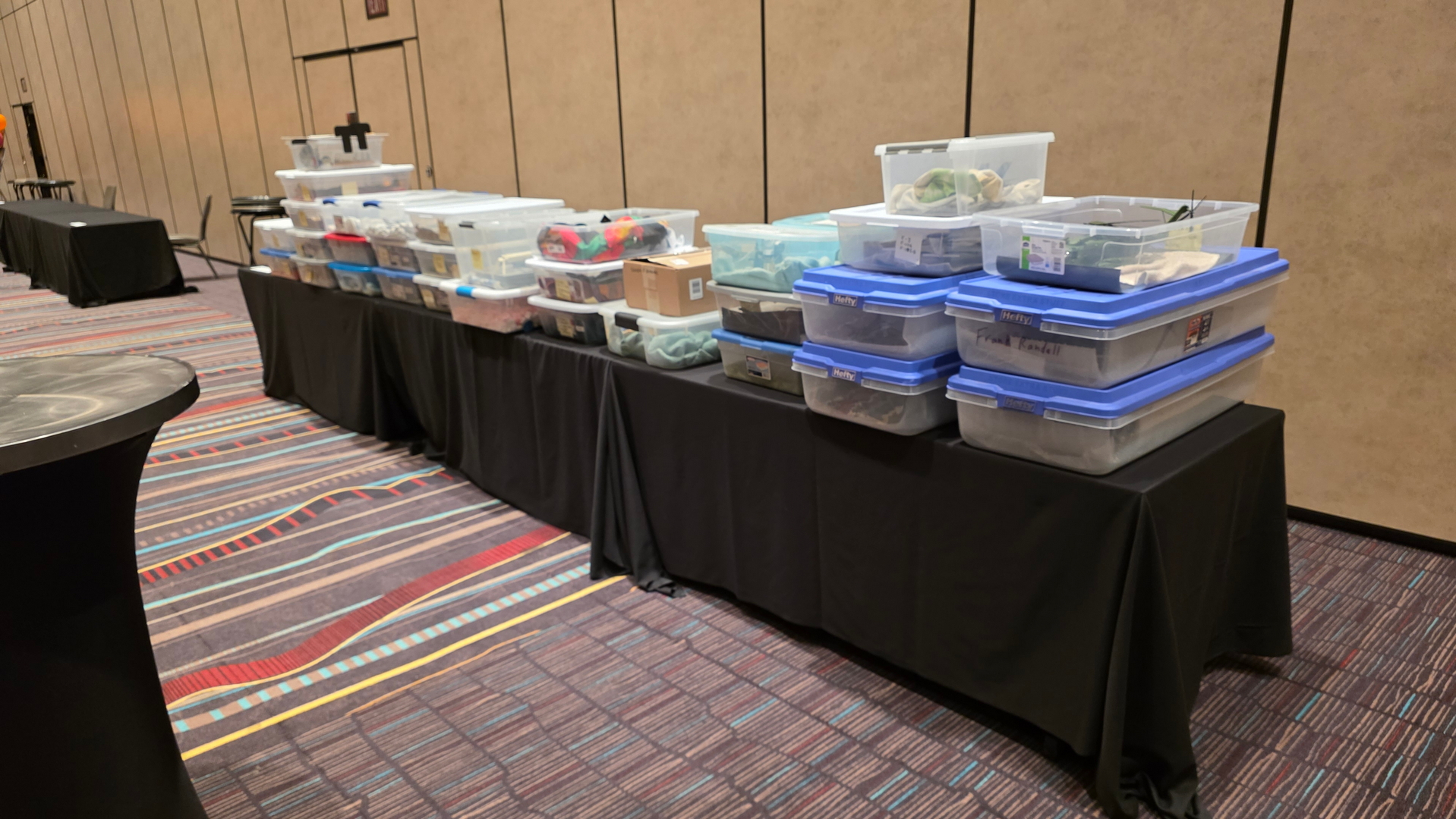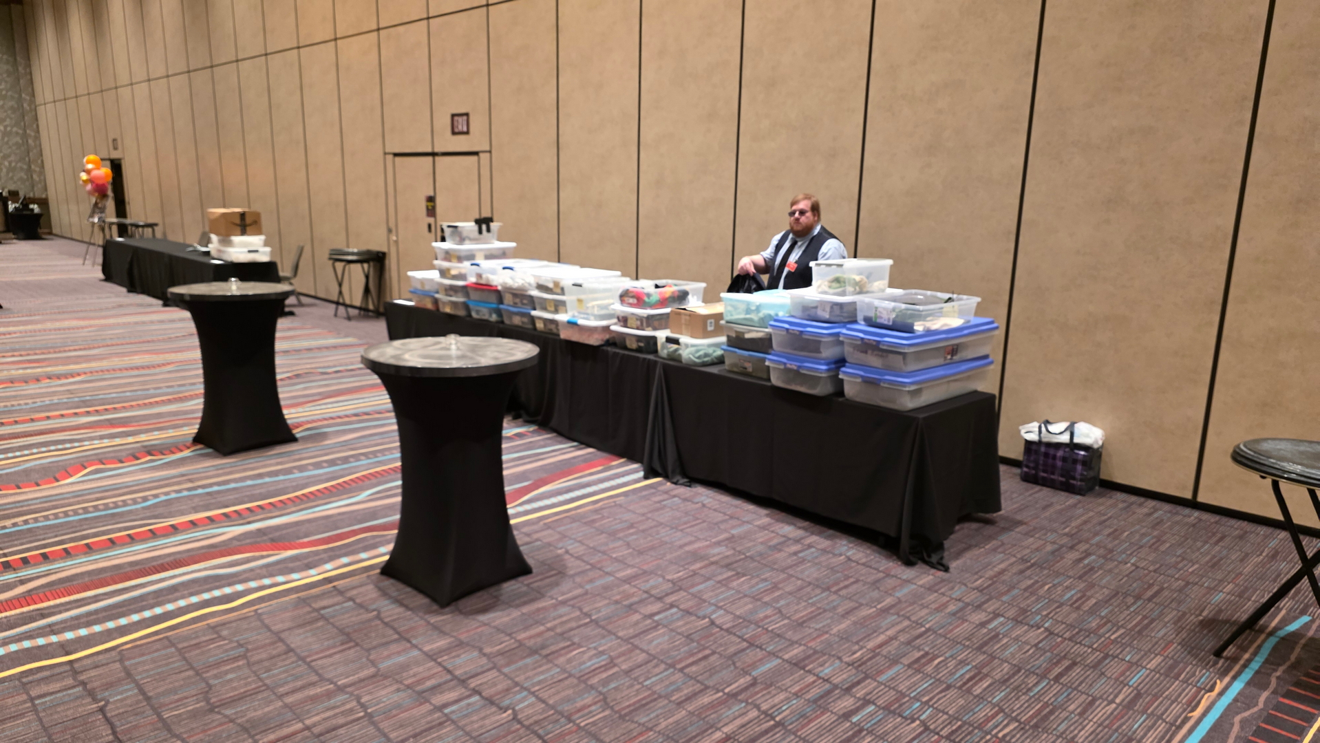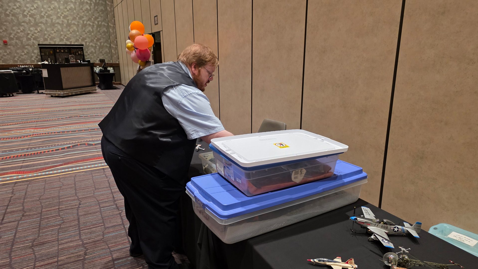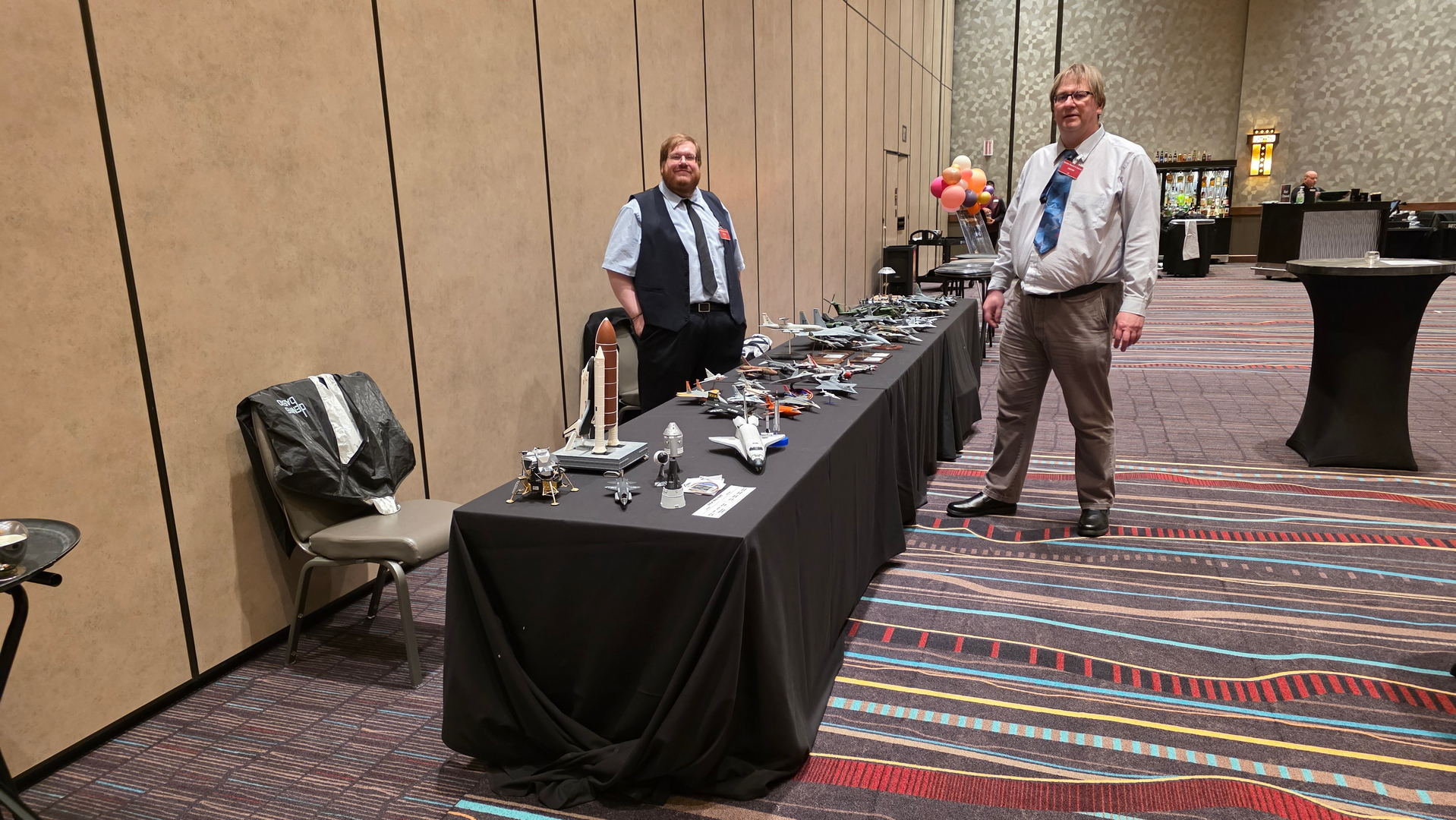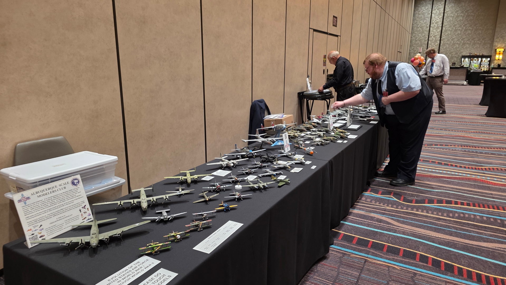 The display was set-up and manned by Brian Peck, Peter Reckhemmer, and Matt and Mike Blohm. As usual the display took about one and a half hours to set up–putting models into the correct grouping and lots of info tags to put out–and about one hour to take down. We did get a full dinner this year thanks to Peter. Models were provided by Frank Randall, Don Gatewood, Victor Maestas, Brian Peck, Len Faulconer, Bob Henderson, Steve Brodeur, David Epstein, and Matt and Mike Blohm. Thanks to all who participated and loaned models. Thanks to Hobby Proz for letting us stage the model tubs at the shop. Please contact me if you are interested in building models to fill out the aircraft types that we still need for the display, including the 1920-30’s period. My own priorities for the 2026 displays will be finishing my 1/144 scale B-36, MC-130J Commando II, and C-133 with a Thor IRBM.