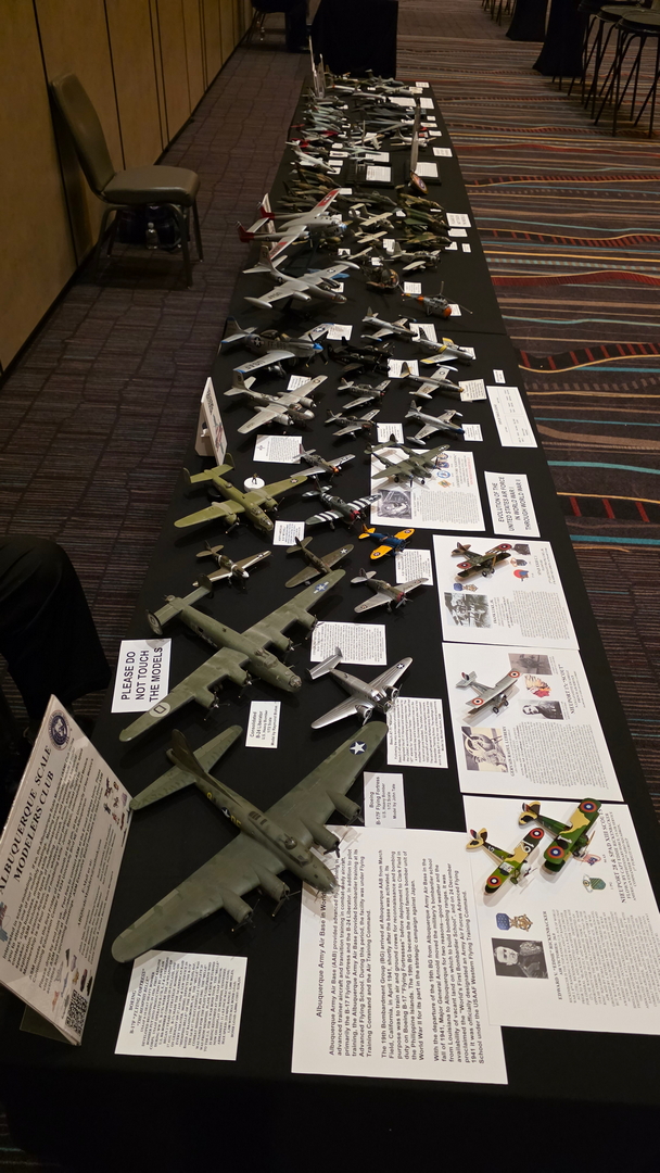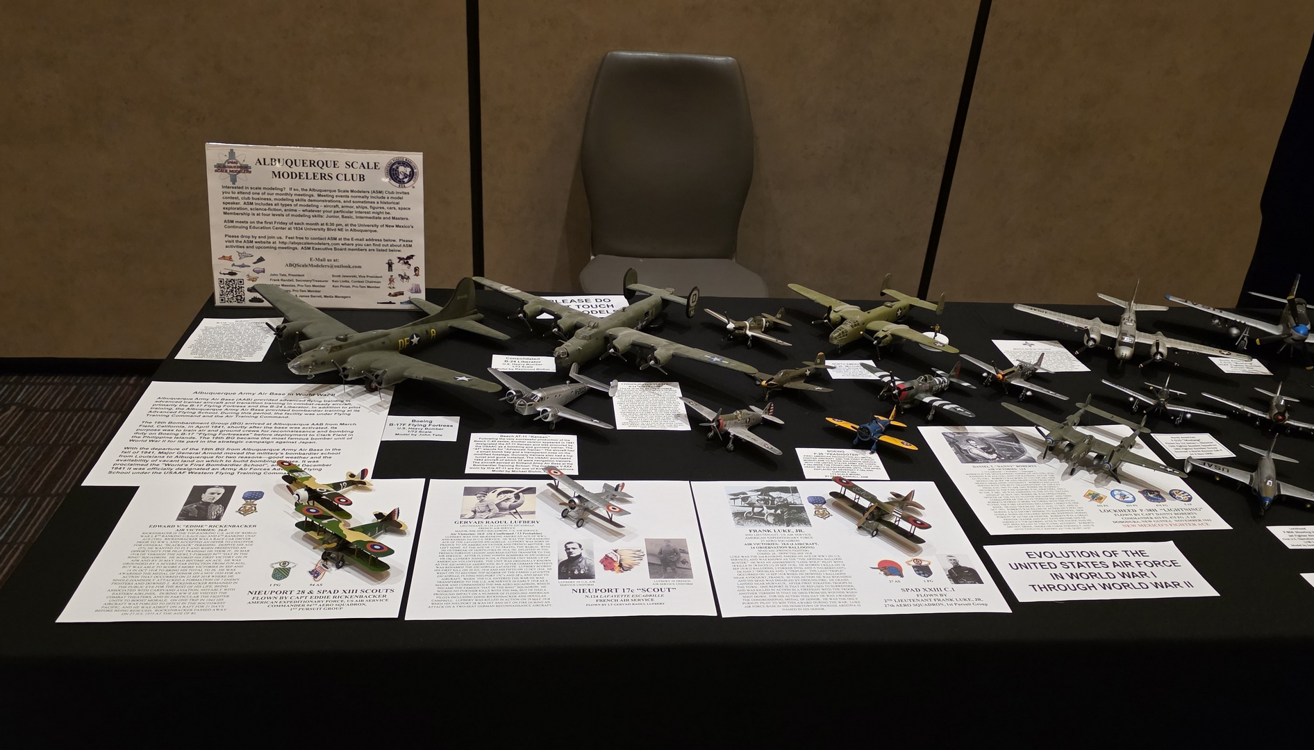ASM conducted a model display at the 78th Anniversary Air Force Ball that was held on Saturday, September 27th at the Sandia Resort and Casino in Albuquerque. This was ASM’s seventh display at the AF Ball event and this year’s display was great and record-setting. The event celebrates the anniversary of the US Air Force becoming a separate service on September 18, 1947. Our display theme was “USAF 1947 to the Present.” We also added a new section on the “Evolution of the USAF from World War I through World War II” in order to highlight significant aircraft and personnel in the U.S. Air Service and the Army Air Corps during that foundational period. We included the WW II Bombardier School at Albuquerque Army Air Base (AAB) and its associated aircraft in that section. More on these later.