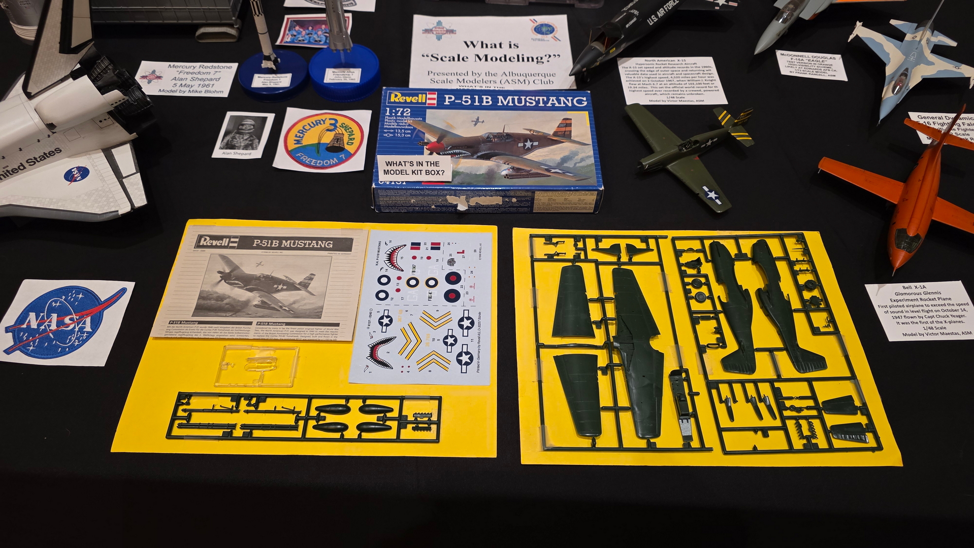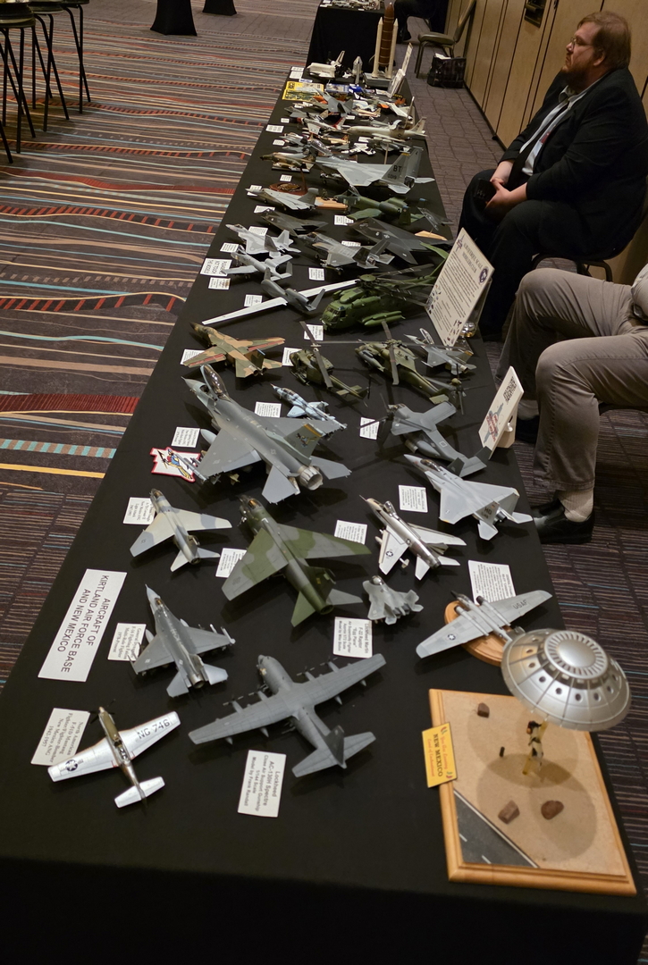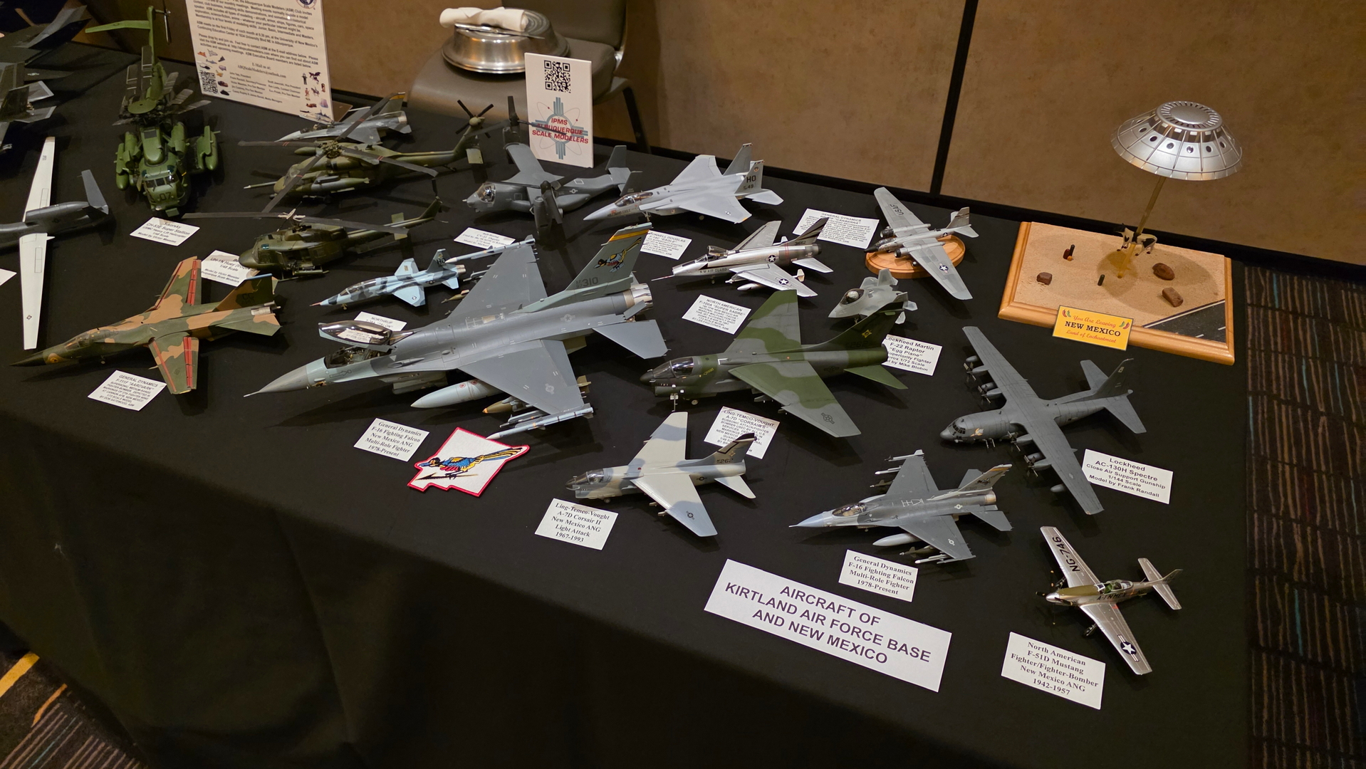 The right set of tables included: space program vehicles (10) and experimental aircraft (10), “What is Scale Modeling/What’s in the Model Box,” modern aircraft post-Viet Nam and from Desert Storm through Afghanistan (22), and finally aircraft of Kirtland AFB and New Mexico (17). See pics 26-29. Newly displayed models included a F-105D by Frank Randall, an F-35 by Don Gatewood, a 1/32 F‑16C of the NM ANG “Tacos” by Adrian Montano, a 1/32 F-15C by Brian Peck, a F-84F in “Thunderbirds” scheme by David Epstein, an F-100A of the NM ANG “Tacos” by Len Faulconer that accidently shot down a B-52, and a RB-57F by Victor Maestas that was assigned at Kirtland AFB for high-altitude air sampling and radiation detection in support of nuclear test monitoring. Matt Blohm and Brian Peck manned these tables.
