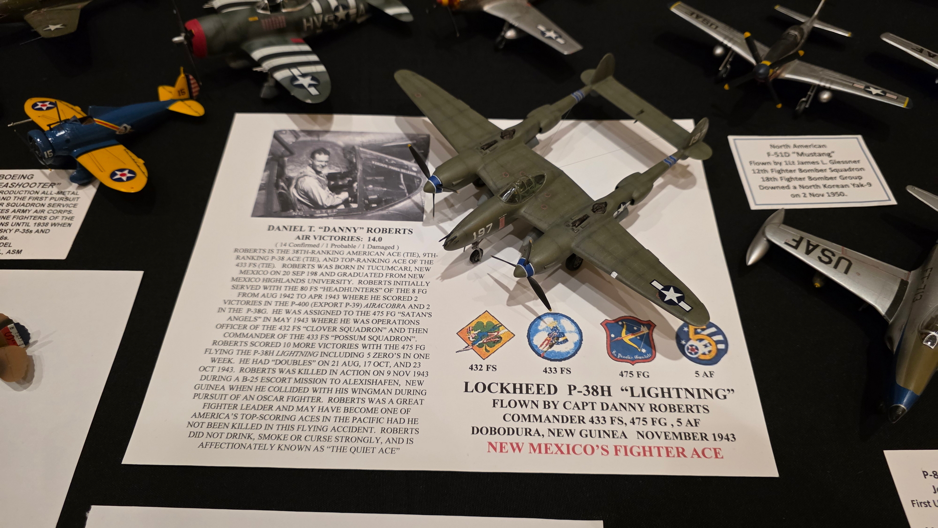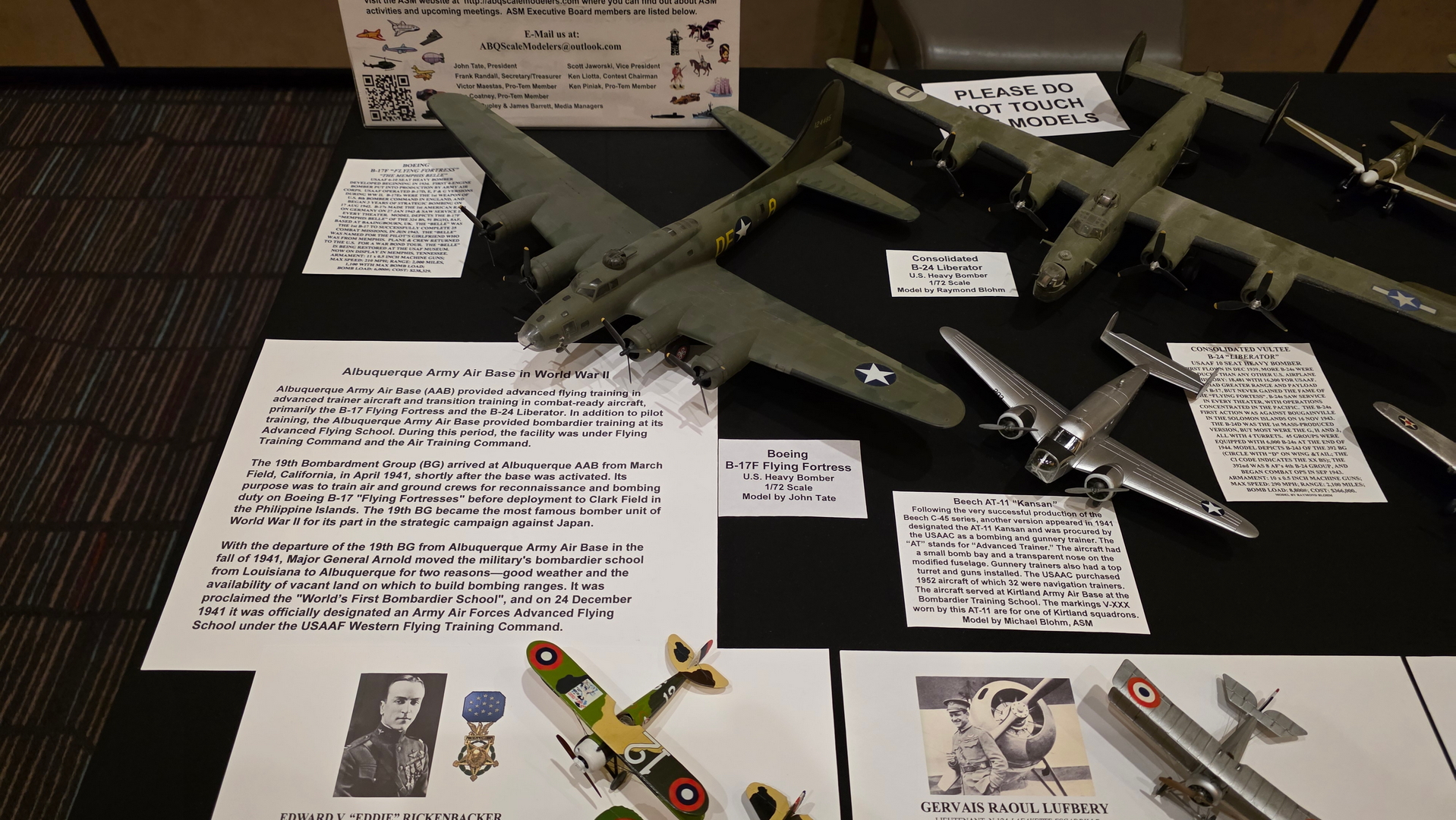 3) The U.S. Army Air Corps in the 1940s: P-38H, P-39, P-40N, P-47D, P-51D, and a B-25B representing the Doolittle Raiders. The P-38H model highlighted Captain Danny Roberts, “New Mexico’s Fighter Ace” who was a leading ace in the Pacific Theater with 14 victories before he was killed in action on November 19, 1943. See pic 32 showing his aircraft and biography for more details on his career. The Albuquerque AAB Bombardier School vignette (pic 33) included an AT-11 “Kansan” bombardier trainer aircraft (newly completed by me for our displays this September), a B-17F “Flying Fortress,” and a B-24 “Liberator” all in 1/72 scale. We will likely keep this new section but we may need to add two more tables (one on each side) to better display all the models.