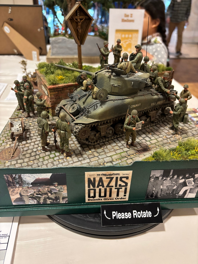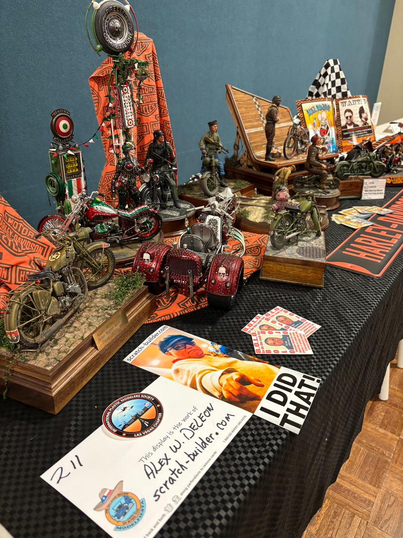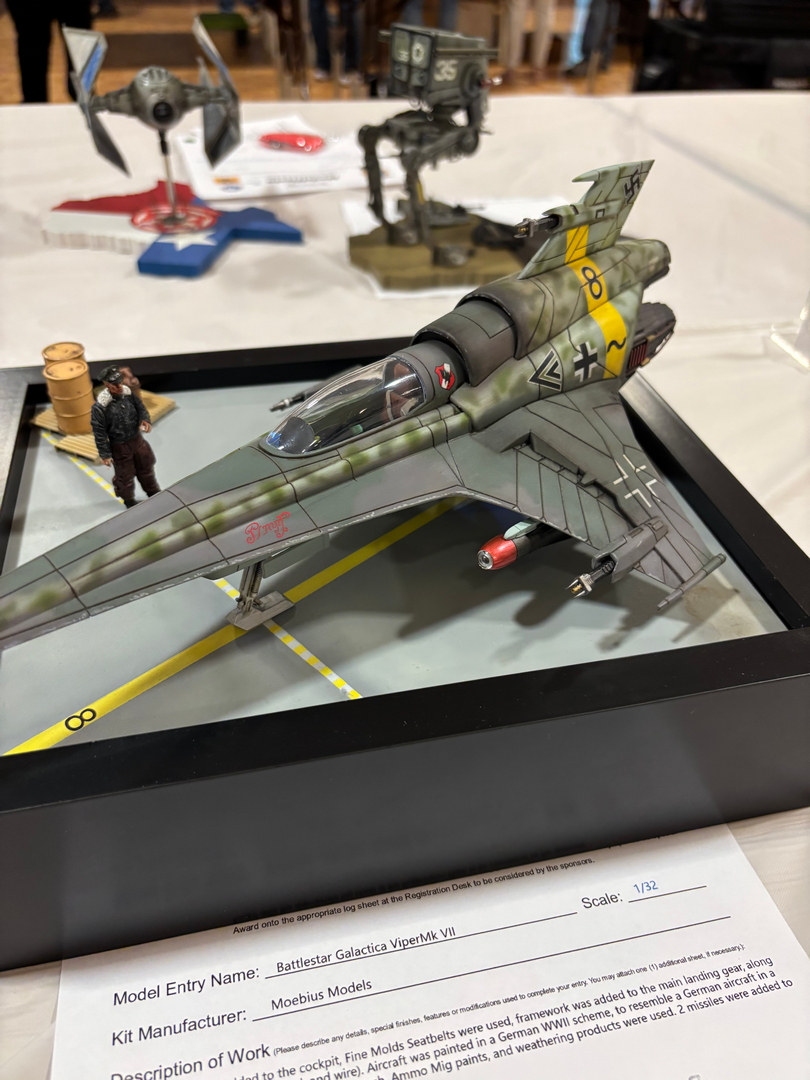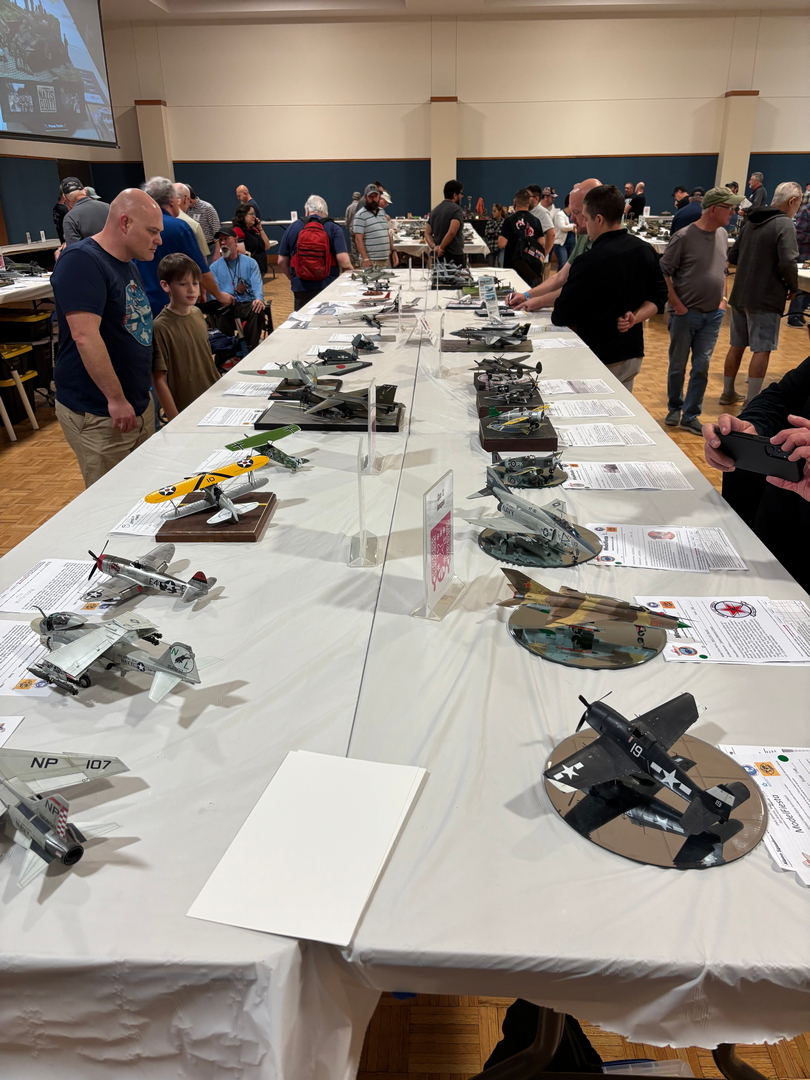 After our initial buying frenzy, it was time to put our models out on the tables. The entry forms were pretty standard, very similar to what we use here in our monthly contests. The difference in this show started at the tables. There were not separate categories for “1/72nd and 1/48. No categories for “soft skinned armor” and “closed top AFVs.” The categories were simply, “Cars,” “Ships,” “Airplanes,” “Sci Fi,” and “Armor.” Everything was on the same table, regardless of scale, regardless of number or type of engines. This led to the second big change from the shows which we are used to. The way the kits were judged was very foreign. Instead of a “first, second, third” setup, each model was judged against a standard. In theory, out of 100 models on the table, there could be 100 gold medal models, or there could be only 5 that met that standard. There were three criteria that were used, Construction Quality for 50 points, Finish Quality for another 50, and finally, Overall Presentation & Scope of Work for 20 points. 100-120 points was good for a “Gold,” 80-99 points would earn a “Silver,” and 79 or below was going to get you a “Bronze.” Each model received a grade card of what the judges liked and what could be improved on. A big issue at most contests is not knowing where the flaws on your model are, as well as not getting any encouraging feedback on what you did right. In theory, the style of judging at this event would really help with both of those issues. The reality was that, as in almost all judged events, different judges will have different opinions as to what a “perfect” model is. With approximately 500 models on the tables, the judges had to move quickly, perhaps some of the work was not looked at as carefully as other pieces. Our biggest takeaway was that the “make or break score” was in the “Overall Presentation” segment. All of us scored well in the Construction and Finish Quality segments, but we were heavily dinged on those last 20 points. I was the only one who had put a base under a couple of my models rather than simply setting them on the tables. This put two of my models over the top and into the “gold medal” class. That was a lesson learned, next year, I think all of the models that we take will have figures, bases, photos, and a lengthy write up of the work that we did to improve the kits.